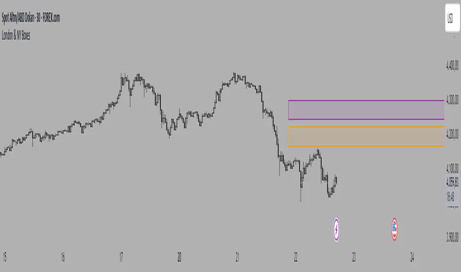 Based on the candles formed during the New York and London sessions throughout the day, the areas where the boxes will be drawn are determined. Between UTC+3 19:00 and 22:00, the boxes are updated and redrawn daily at the user’s selected time.