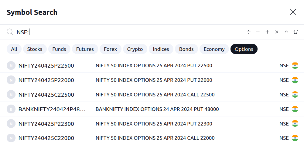 NSE opsiyonları sembol aramada mevcuttur. Bu verilere erişmek için sembol aramasına gidin, Seçenekler sekmesini açın ve borsa öneki olan "NSE:" yazın.