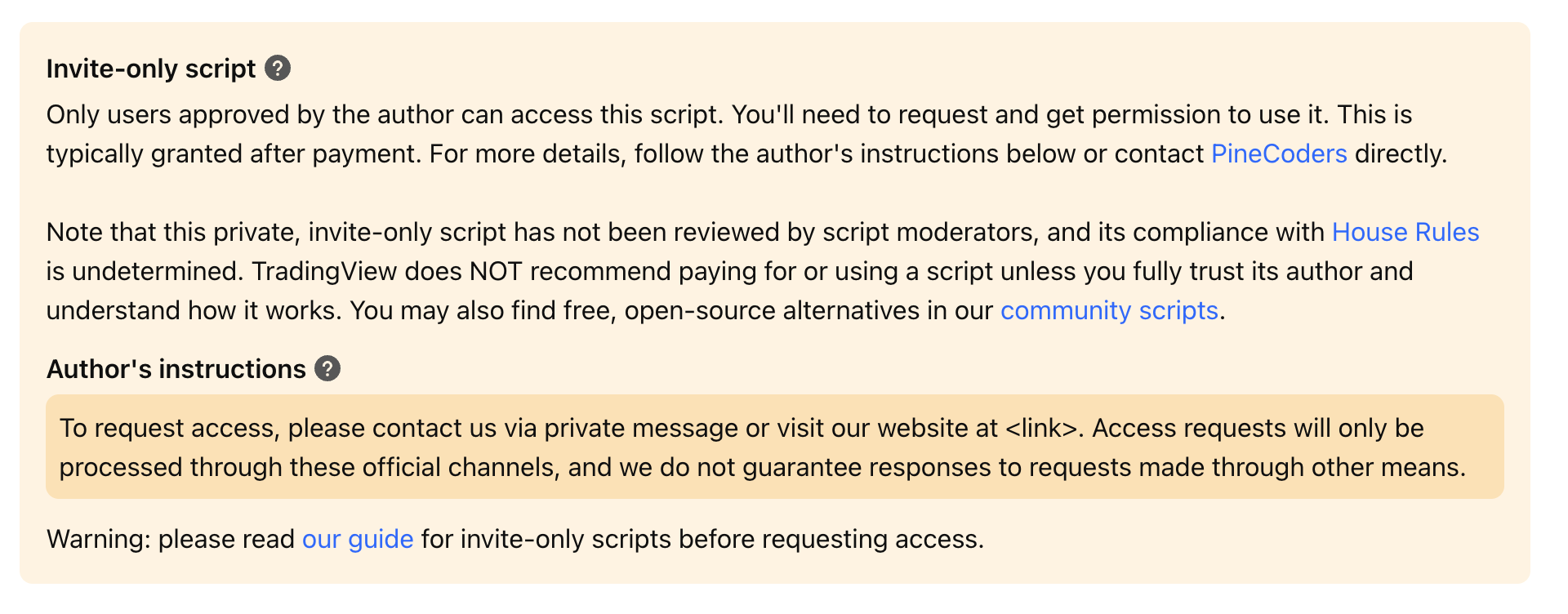 Düğme kullanılamıyorsa, gösterge veya strateji yalnızca davetlidir, yani yazardan izin almanız gerekir. Erişim talebinde bulunmak için lütfen yazarın yayın gövdesinin sağında veya altında bulunan talimatlarını izleyin. Farklı gösterge türleri hakkında daha fazla bilgiyi buradan edinebilirsiniz.