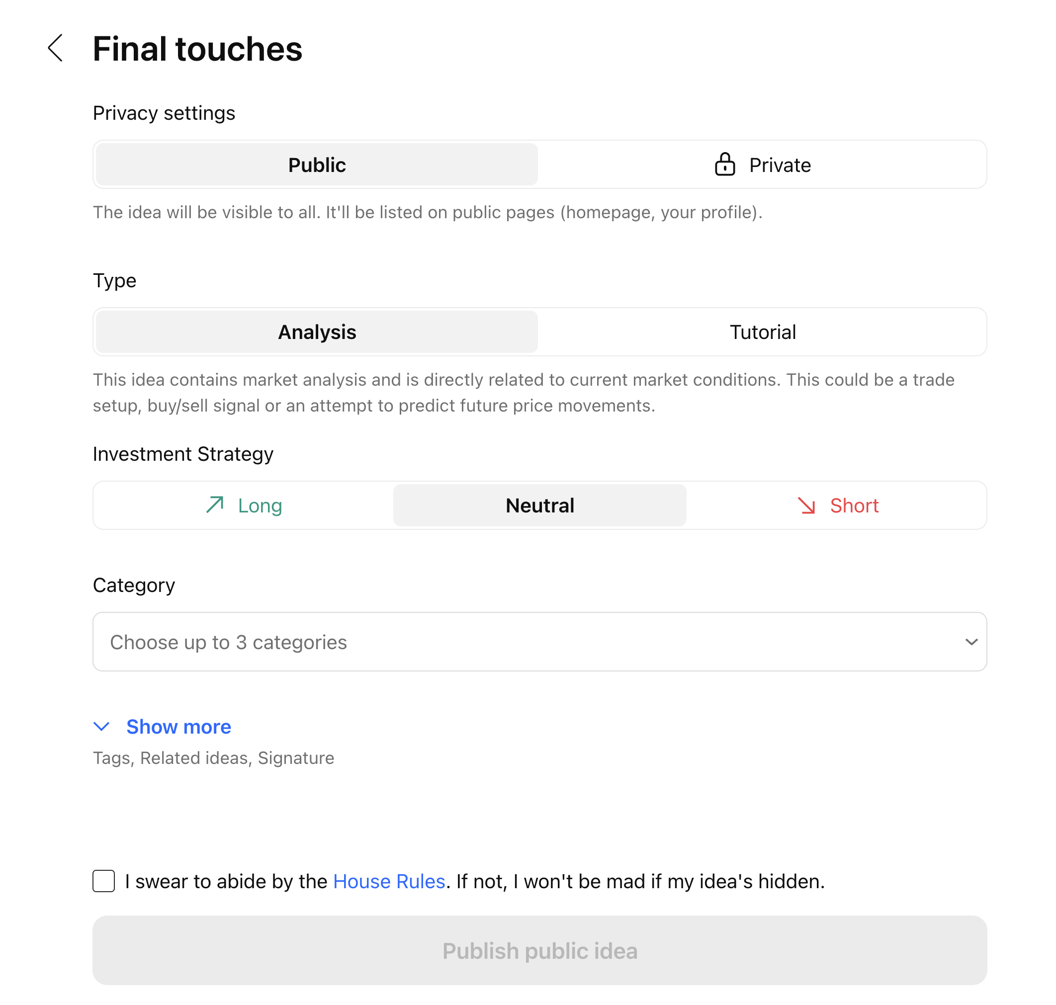 - Fikriniz için net bir başlık ve tanımınız olduğundan emin olun. Bu, TradingView topluluk üyelerinin dikkatini çekmek için çok önemlidir. Açıklayıcı ve ilgi çekici bir başlık, fikrinizi açık ve öz bir şekilde aktarmanıza yardımcı olur. Bir başlığa karar verdikten sonra, fikrinizin açıklamasının da anlaşılır ve ilgi çekici olduğundan emin olun. Yalnızca ne düşündüğünüzü değil, NEDEN düşündüğünüzü de açıklayın. Kesin bir temel analiz ile başlamak her zaman harikadır. Dışarıdan birinin bakış açısıyla mantıklı olduğundan emin olmak için açıklamanızı tekrar okuyun.