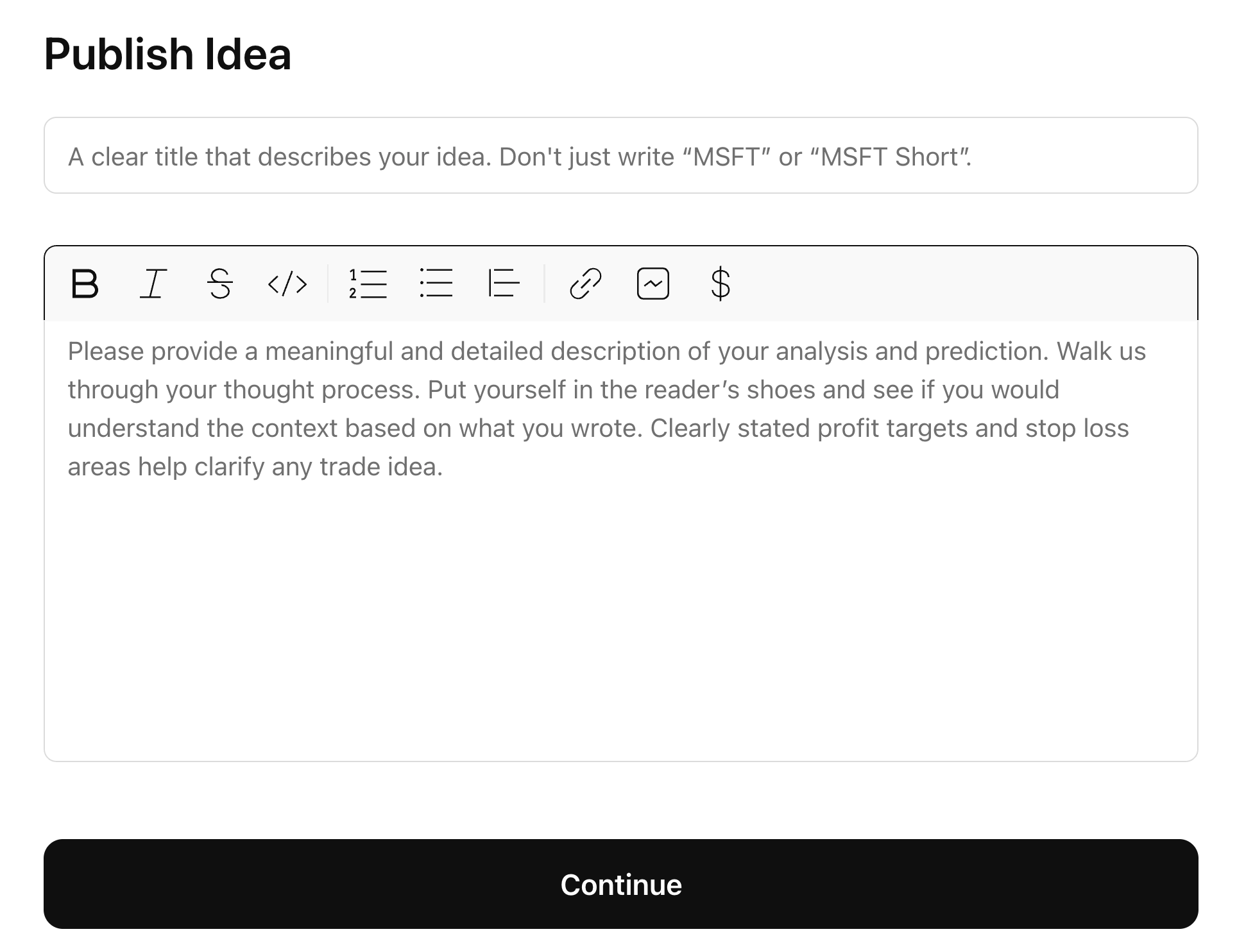 TradingView'in basit alım veya satım çağrıları arayanlar için bir platform olmadığını unutmamak önemlidir. Topluluğumuz akran değerlendirmesi tarafından yönlendirilir, yani kullanıcılarımızın karlarını en üst düzeye çıkarmayı amaçlayan yararlı ve açıklayıcı fikirleri paylaşmaya, incelemeye, eleştirmeye ve bunlardan öğrenmeye ve geliştirmeye odaklanıyoruz. Bu, bir platform olarak temel güçlü yönlerimizden biridir. Bu nedenle, mümkün olduğunca kapsamlı ve açıklayıcı olmak, fikirlerinizin fark edilmesini sağlamanın en iyi yoludur. İşte ilk fikrinizi yayınlamaya başlamadan önce yapmanız gereken bazı yazılar: