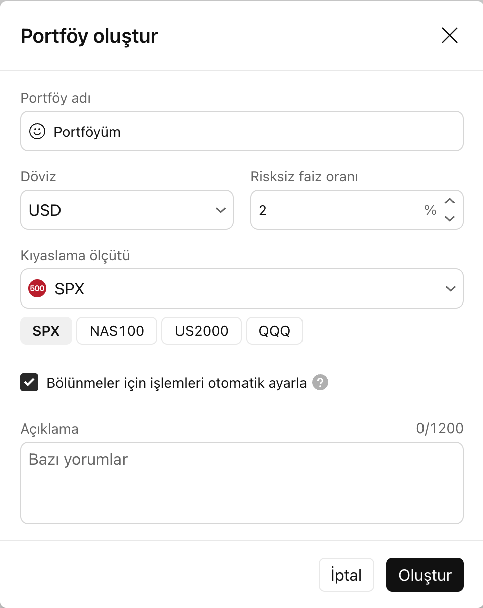 - Kıyaslama Ölçütü — piyasa performansı kıyaslama ölçütü. Portföyünüzün performansını bir piyasa referansıyla karşılaştırmanıza olanak tanır. Kıyaslama ölçütü olarak portföyünüzün piyasasına veya sektörüne karşılık gelen bir endeks veya fon kullanmanızı öneririz. İlgili makalede daha fazla bilgi edinin.