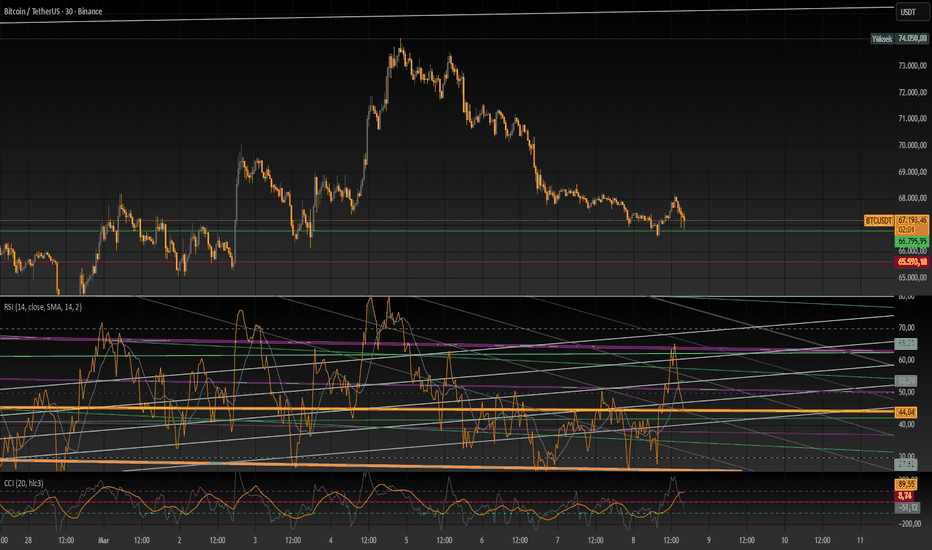 BTC BÜYÜK RESİM Eğer ters flama çalışırsa Haziran ayının ilk haftasında tam dibi görebiliriz. Sadece tahmindir yatırım tavsiyesi içermez. En kötü Hazirandan sonra kopuş ihtimali artar. Bu savaş ortaminda yükselişler güçlü bir boğa getirmeyebilir. Ancak hazirana doğru olası müzakereler ile boğa tetiklenebilir. Long