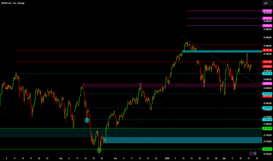 GER40Alman endeksi, 25.297 seviyesine temas ettikten sonra satış baskısıyla karşılaştı. Mevcut görünümde 24.741 seviyesi hâlâ çalışır nitelikte bir destek konumunda ve bu bölgede tutunma çabası dikkat çekiyor.