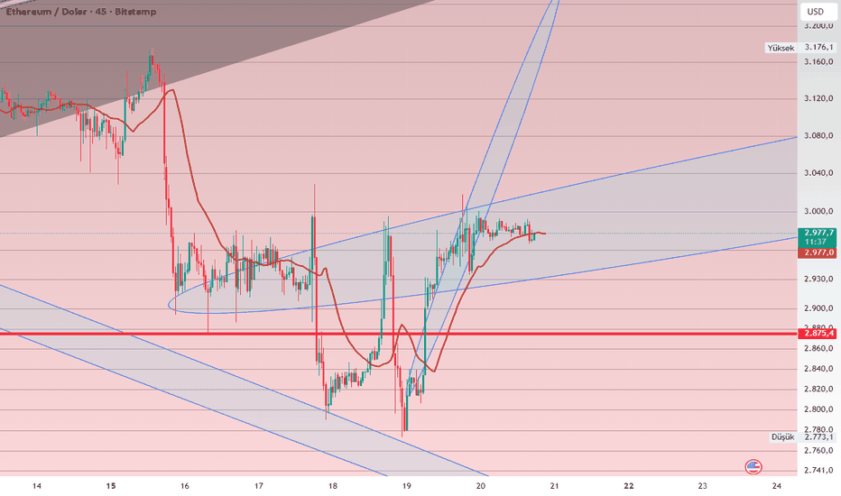 ETHUSD 4(H) AnalizUzun süredir devam eden düşüş trendi içinde fiyat, üçgen formasyonunun sıkışma bölgesine temas etti ve yapının en dip noktası olan 2.625 seviyesinden destek alarak 2.865 bölgesine kadar yükseldi.