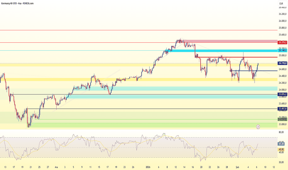 Ger40 24509 seviyesindeki fuşya renkli kritik bölge, mevcut fiyat davranışıyla birlikte ikili dip oluşumu ihtimalini güçlendirmekte...