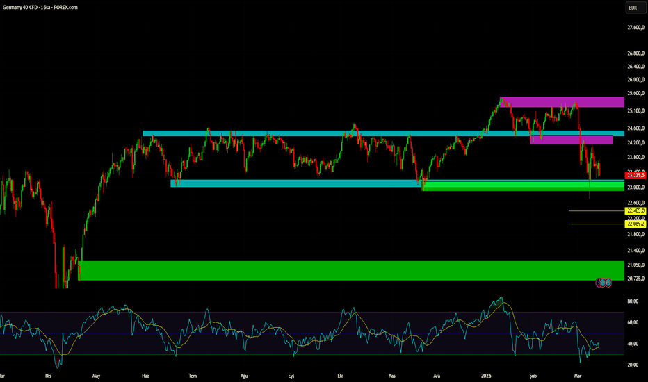 DAX Sıkışıyor, Yön ArıyorGrafiğe baktığımda fiyatın bir süredir yatay ama hafif aşağı eğimli bir yapı içinde sıkıştığını görüyorum. Üst tarafta çizilen düşen trend ve hareketli ortalamalar fiyat üzerinde baskı kurmaya devam ediyor. Özellikle 23.540 – 23.600 bölgesi kısa vadede güçlü bir direnç gibi çalışıyor fiyat birkaç ke