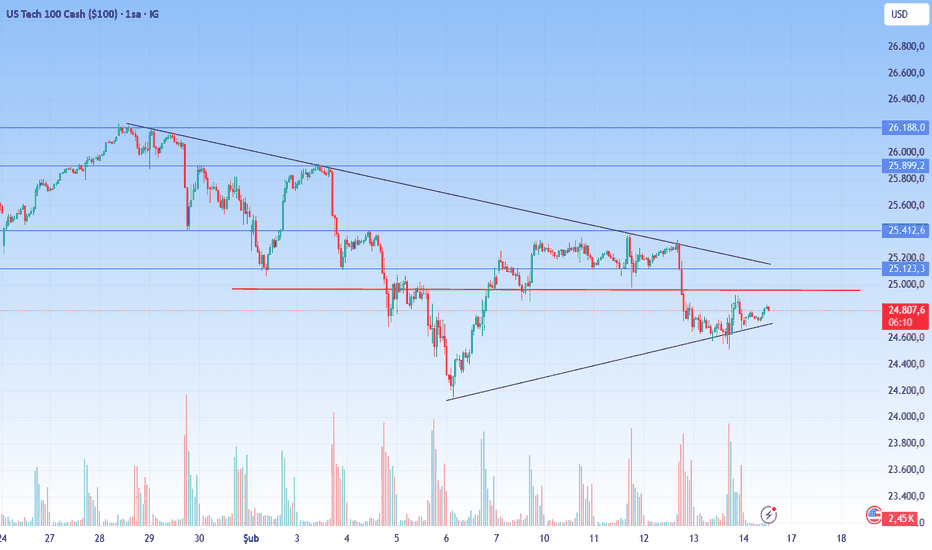 NASDAQ 1(H) Teknik AnaliziUS Tech 100 (Nasdaq) 1 saatlik grafikte fiyat, bir süredir sıkışan ve yön arayan bir yapı içinde hareket ediyor. Yukarıdan gelen alçalan trend çizgisi ile aşağıdan gelen yükselen trend çizgisi, piyasada net bir kararsızlığa işaret ediyor. Bu yapı, kısa vadede yönün henüz netleşmediğini ancak kırılım geldiğinde hareketin sertleşme potansiyeli taşıdığını gösteriyor.