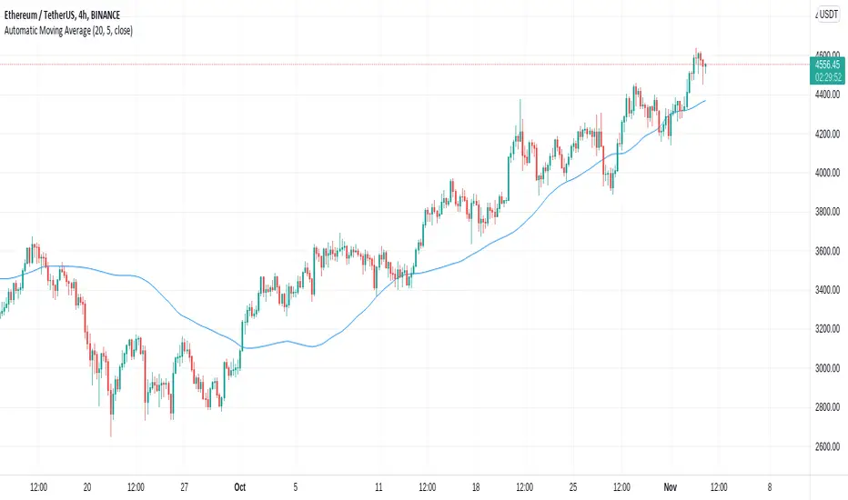 Automatic moving average removes the need to set the moving average length manually. The indicator progressively finds a suitable length that minimizes the number of candle body touches and maximizes the number of wick touches.